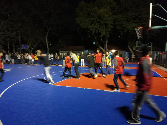 刚开场师生们一片和乐融融,双方队员依次握手问候,并一起在场上合影留念。随着哨声响起,比赛正式开始。平时驰骋在三尺讲台上的老师,上场后技术娴熟,控球、跑位毫不马虎。教师联队率先发力,首得两分,赛场旁的观众顿时欢呼起来。学生联队被自己老师打了一个措手不及,开始加强了防守,凭借着身体素质和充沛精力,通过一个长传在篮下空的情况下追平两分。随后双方互相你追我赶,比分交替上升。第一节结束,教师联队以18:15领先学生联队3分。稍事休息后第二节比赛继续进行。虽然学生联队凭借着敢冲敢闯的拼劲,为自己赢得了很多分数,但是这也导致了他们的频频犯规,给了教师联队多次罚球的机会,而教师们凭借着精准的投篮技术,稳扎稳打,三分球总是赢得观众们的阵阵欢呼,让学生们始终没有赶超自己的机会。第二节仍然是教师联队领先,比分33:29。