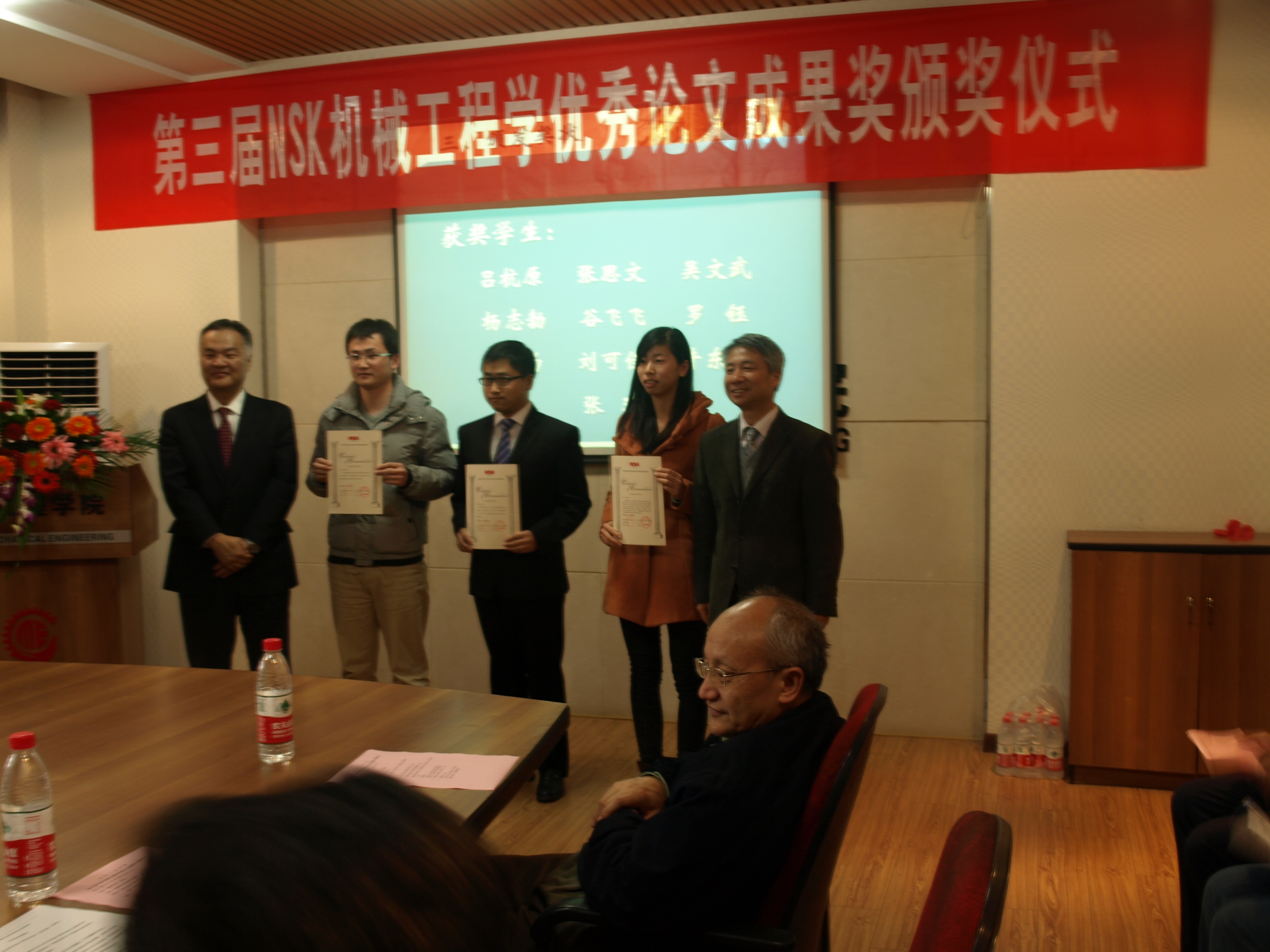 “NSK机械工程学优秀论文成果奖”,是由恩斯克投资有限公司设立的奖学金,旨在鼓励在机械工程专业领域内做出独特贡献和刻苦钻研的优秀研究生,今年是第三届,受奖学生10人,每人奖励5000元人民币。获奖名单是:吕杭原、张思文、吴文武、杨志勃、谷飞飞、罗钰、张琪、刘可佳、牛东辉、张伟为。