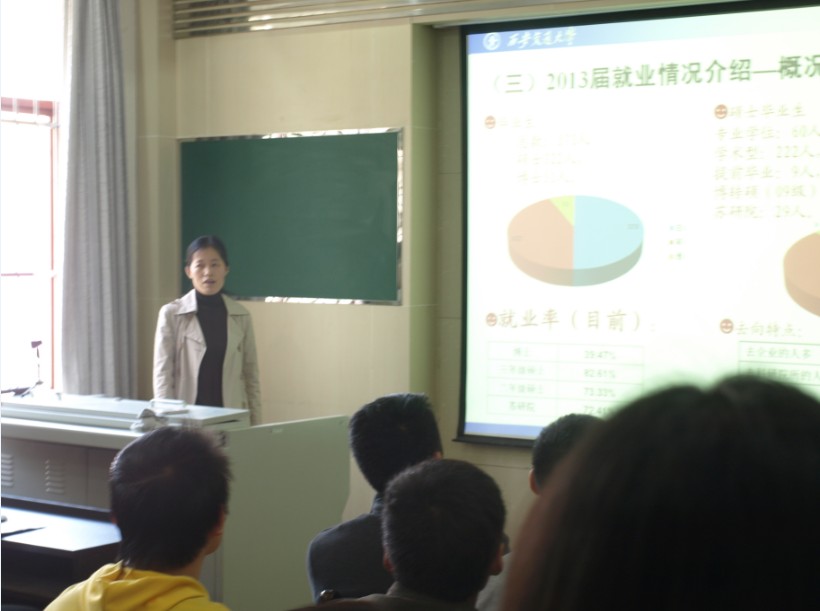 首先,雷老师对2012届和2013届毕业研究生的就业情况图表并茂,分门别类的进行了详细介绍。根据最新统计数据,在370名2013届毕业研究生(硕、博)中,硕士签约率达到80%以上。与去年相比,今年的就业去向特点仍然是:去企业的人最多(超过5成),其次是去科研院所(超过3成)。近年来,在就业形势日趋严峻的情况下,成人直播