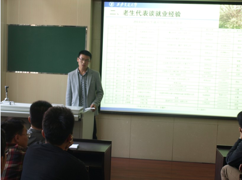 在交流会上,来自于不同学制、不同专业、不同性质就业单位的15位毕业研究生热情地分享了他/她们在求学、求职过程中的成长经历,给即将面临就业的师弟师妹们提供了宝贵经验和建议。本次邀请的毕业生签约单位分别是:腾讯科技(深圳)有限公司、中国电子科技集团公司第十四研究所、陕西鼓风机(集团)有限公司、中国电子科技集团公司第十研究所、中国建设银行股份有限公司重庆市分行、中国航空工业第六一八研究所、中国航天科工集团第二研究院二〇六所、壳牌中国、一汽-大众汽车有限公司、上海大众汽车有限公司、中国科学院长春光学精密机械与物理研究所、宝洁、固高科技(深圳)有限公司、中国船舶重工集团公司第七一一研究所等。