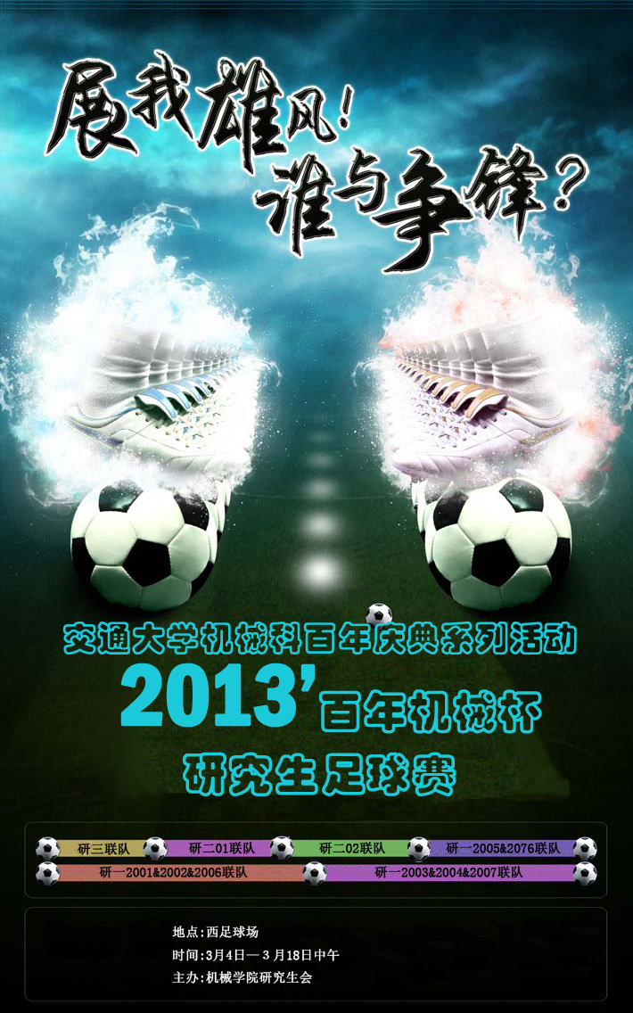 研究生“百年机情”杯足球赛。本次活动以“欢庆学院百年诞辰,增强各级同学交流”为宗旨,以促进学院各班、各年级之间的了解及交流、增进同学友谊、丰富同学课余生活为目的,以增强同学们的体质、提高学院的足球竞技水平、加强团队合作精神、促进科研为目标,是成人直播