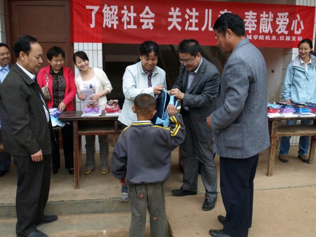 机关支部与仪器支部积极响应学院分党委开展“创先争优”活动的号召,组织党员深入农村小学,进行了“了解社会、关注儿童、奉献爱心”的主题活动。两个支部来到蓝田县三里镇李后村小学,为15位特困生送去了书包、文具等学习用品,鼓励学生们好好学习,报效祖国,并且和李后村村支书及小学校长、老师进行座谈、交流,了解村办小学的现状和存在问题。
